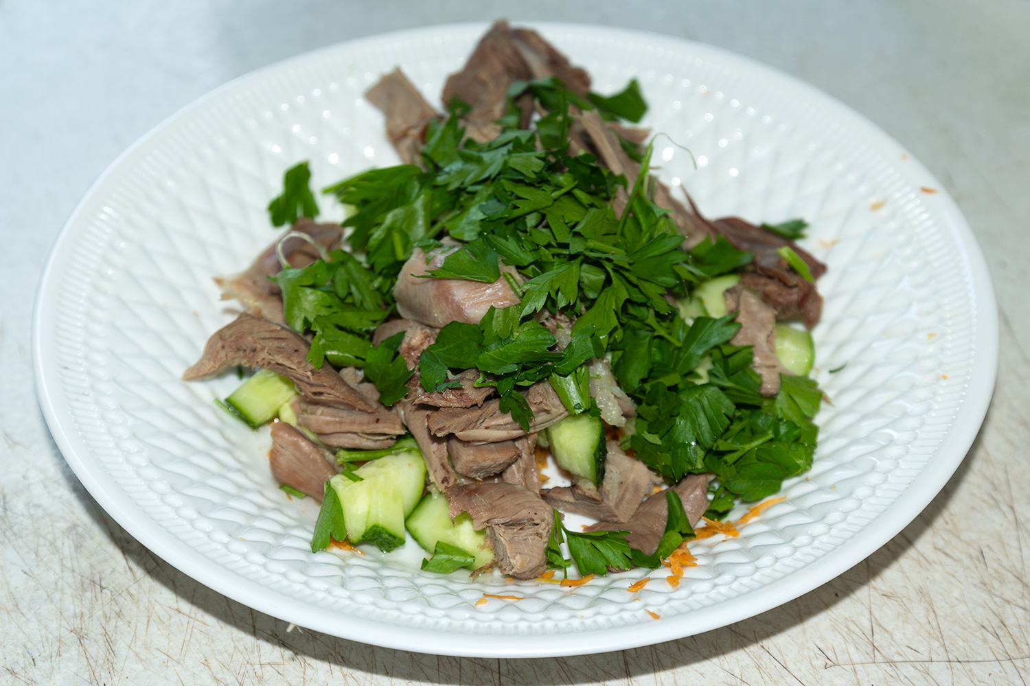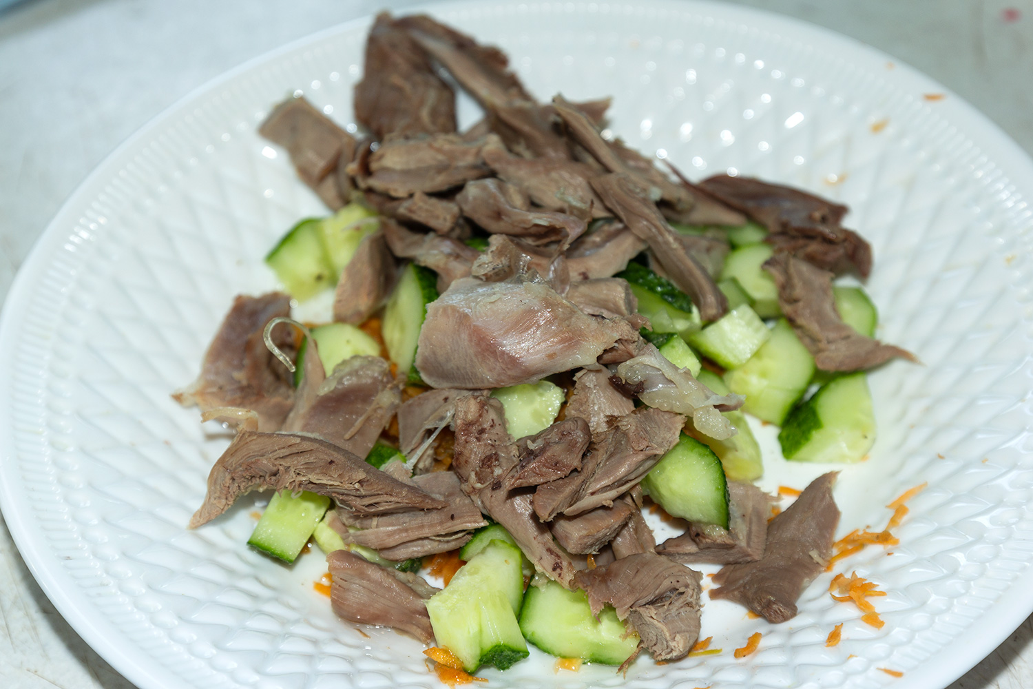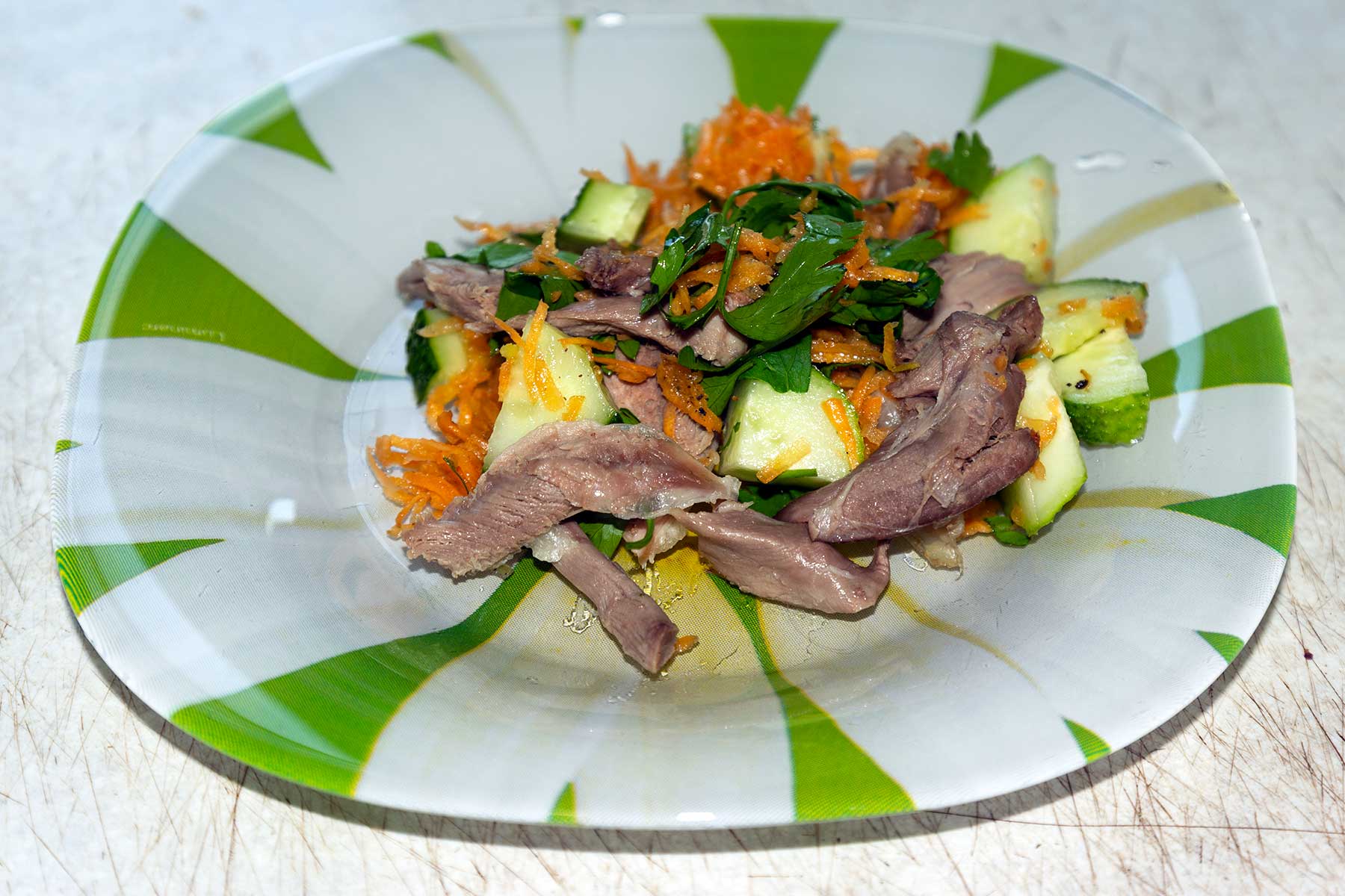 К морковь в салатник добавить нарезанные огурец и мясо.