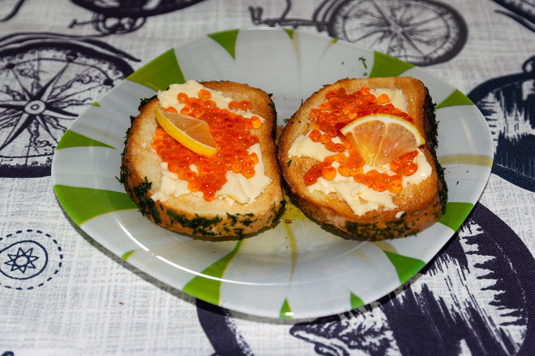 Сверху хлеб намазать сливочным маслом, выложить икру и украсить ломтиком лимона.