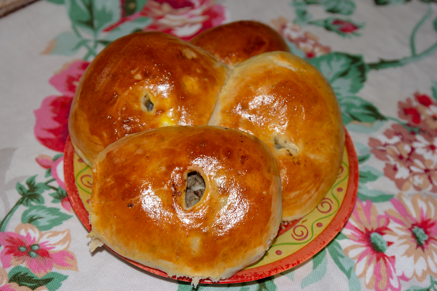 Тесто выложить на присыпанную мукой доску, тонко раскатать, вырезать выемкой кружки. Положить на середину каждого начинку, защипнуть края, оставив середину открытой. Выложить изделия на противень, смазанный растительным маслом, дать расстояться в теплом месте.