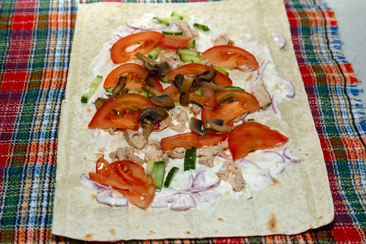Лаваш расстелим на столе. Смажем сметанным соусом. Поверх выложим мясо, грибы, огурец, помидор.