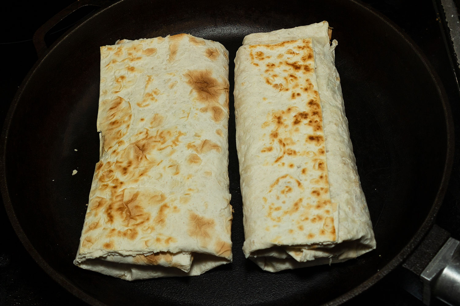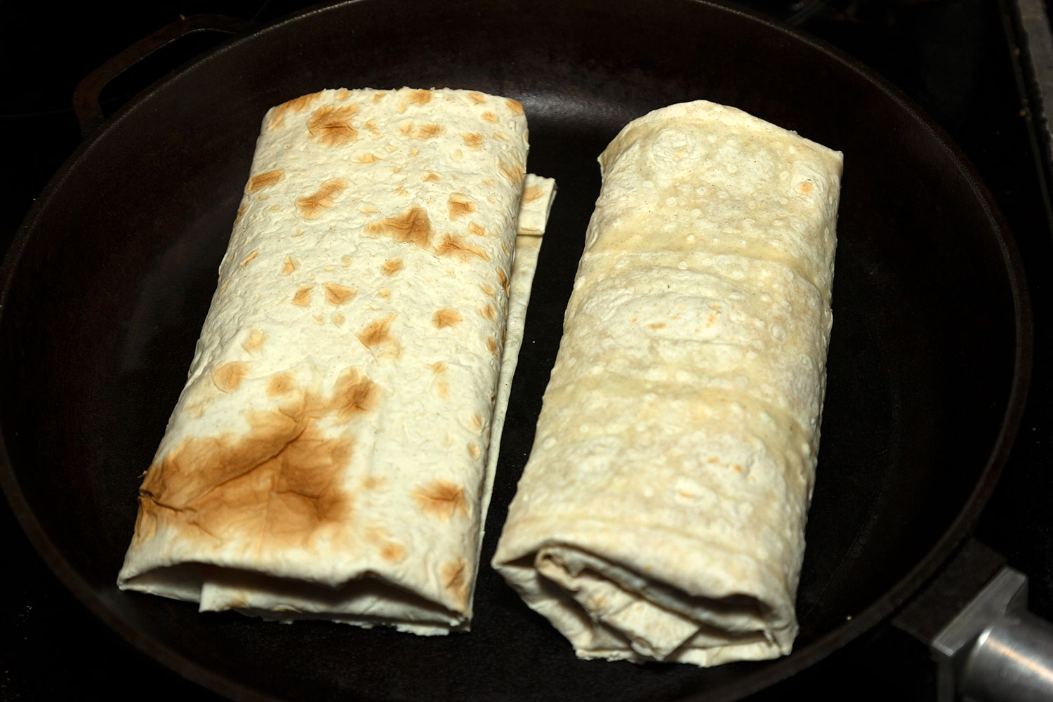 Свернем лаваш в конверт и обжарим на сухой сковороде сперва с одной стороны.