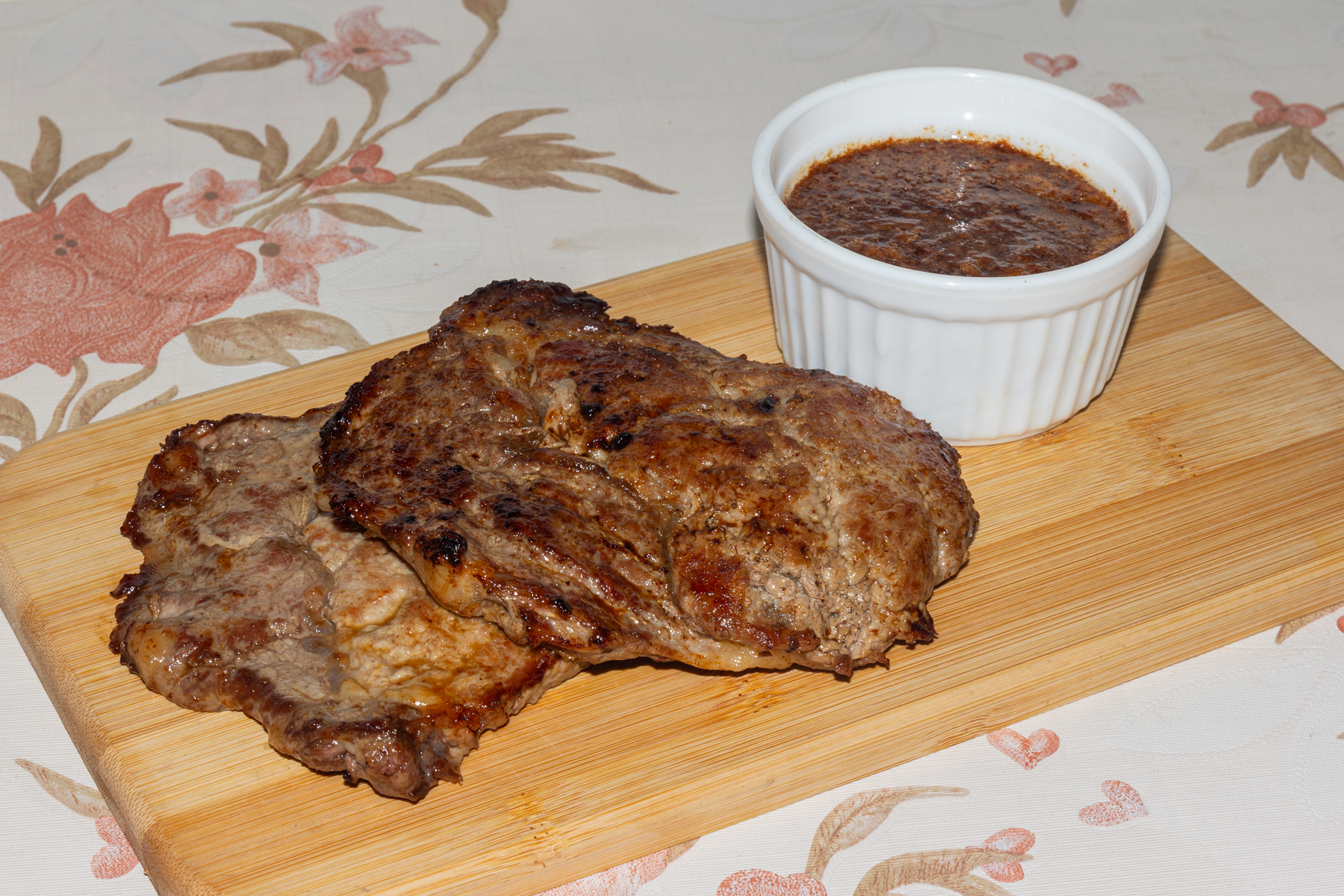 Выложить подготовленные бифштексы на разогретую со сливочным маслом сковороду и обжарить с обеих сторон до образования золотисто-коричневой корочки. Затем огонь уменьшить, мясо сбрызнуть белым вином (1 ст. ложка) и довести до готовности. Готовые бифштексы выложить в глубокое блюдо. В сковороду, в которой жарилось мясо, влить оставшееся вино, коньяк, концентрированный мясной бульон и на сильном огне довести смесь до кипения. Полученным соусом полить мясо.