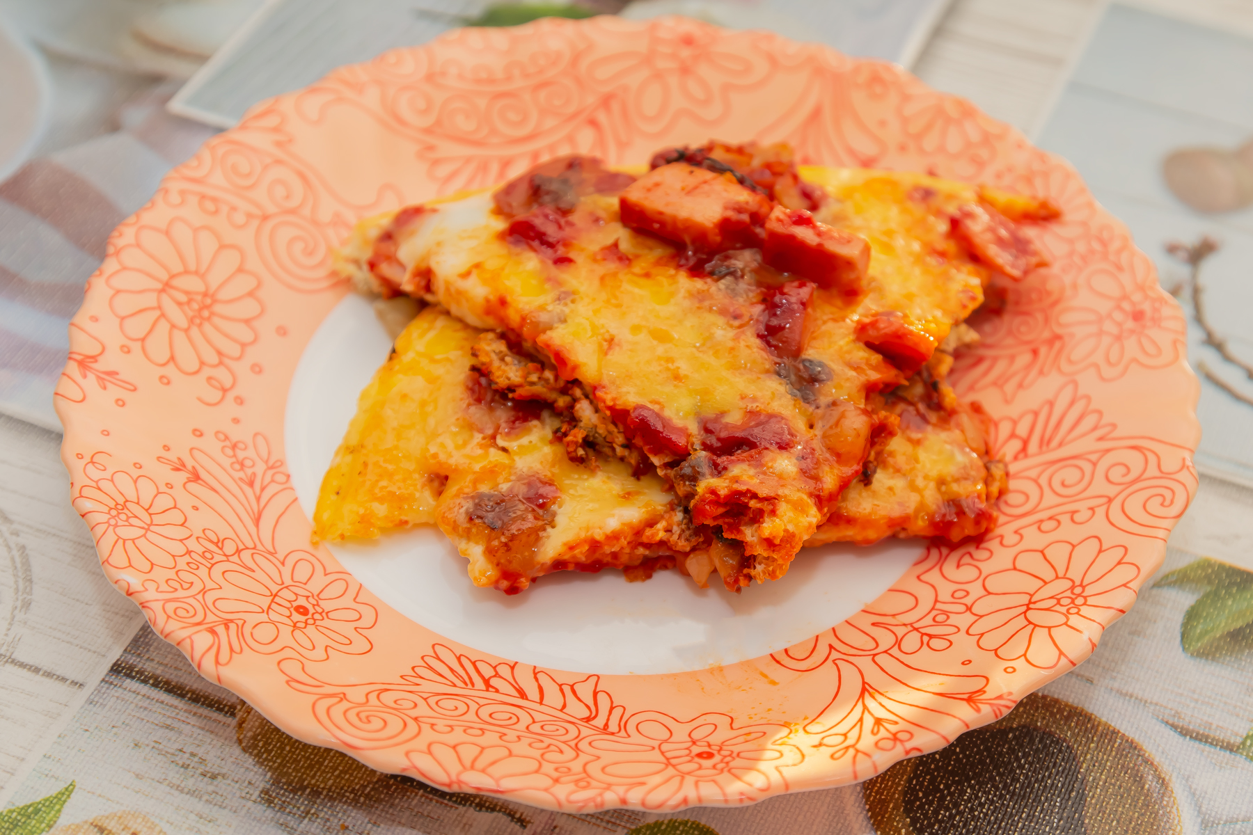 Сало нарезать мелкими кубиками, положить на разогретую сковороду и зажарить до получения шкварок. Шкварки вынуть, а в растопленное сало положить лук, нарезанный очень тонкими полукольцами, и обжарить его до золотистого цвета. Лук вынуть. На ту же сковороду положить нарезанную кубиками колбасу и обжарить ее со всех сторон. Добавить томатную пасту, лук и шкварки, перемешать. Залить все яйцами, хорошо взбитыми с солью, и довести до готовности огне под крышкой.