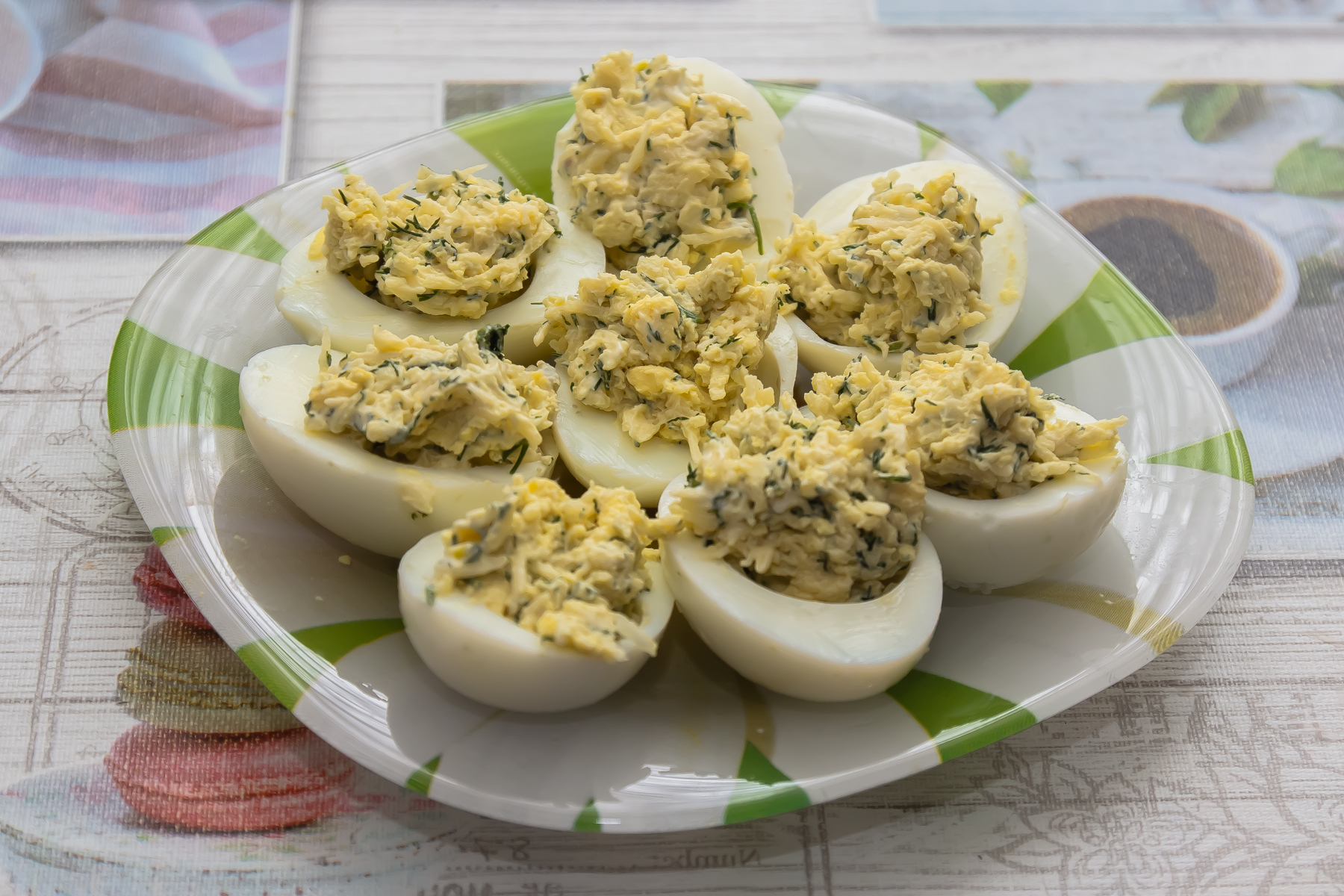 разрезать пополам (поперек), вынуть желтки. Сыр натереть на мелкой терке. Чеснок мелко порубить.
