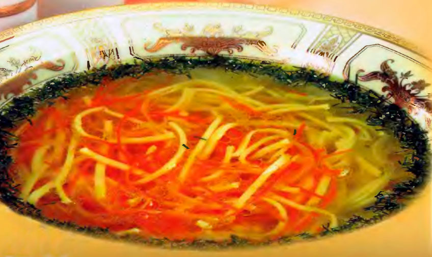 • Из яичных желтков и муки замесите тесто Муку вводите постепенно - тесто должно быть густым и пластичным. Накройте тесто тканью на 30 минут. Затем раскатайте в тонкий пласт, нарежьте на полоски шириной 4 см и слегка подсушите. Сложите полоски друг на друга и нашинкуйте соломкой.