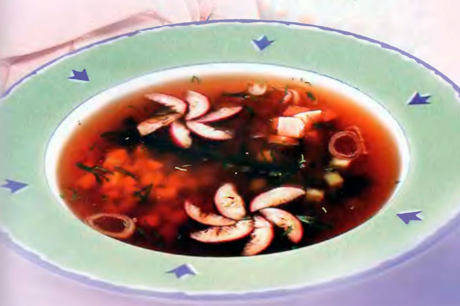 • Подготовленные продукты соедините, добавьте лук, укроп, соль, сахар, хрен, залейте квасом.