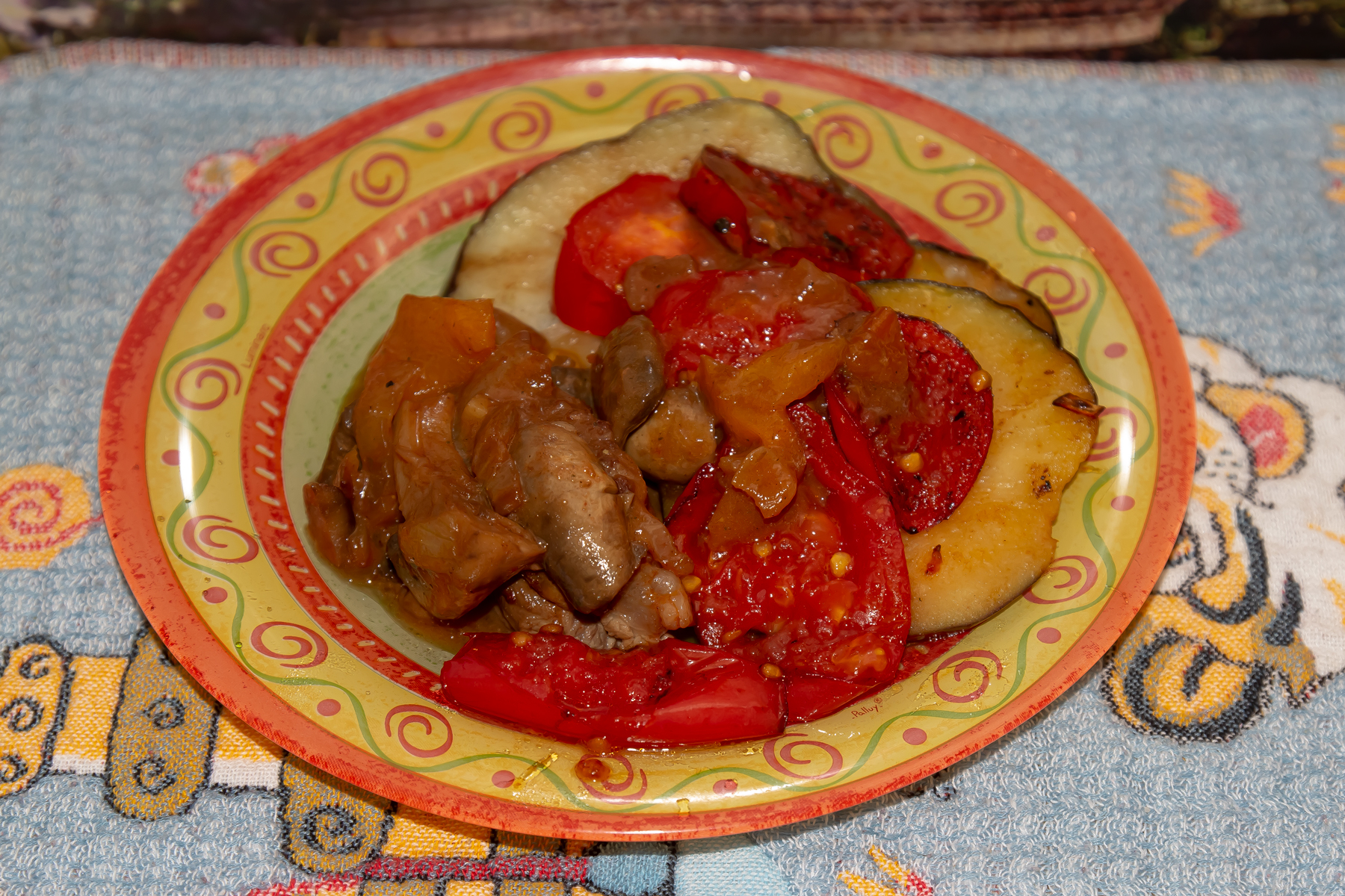 Готовое мясо выложить на блюдо, залить полученным при тушении соусом с грибами и посыпать рубленой зеленью. Баклажаны и помидоры нарезать кружочками, обжарить в разогретом масле, подать с мясом в качестве гарнира.