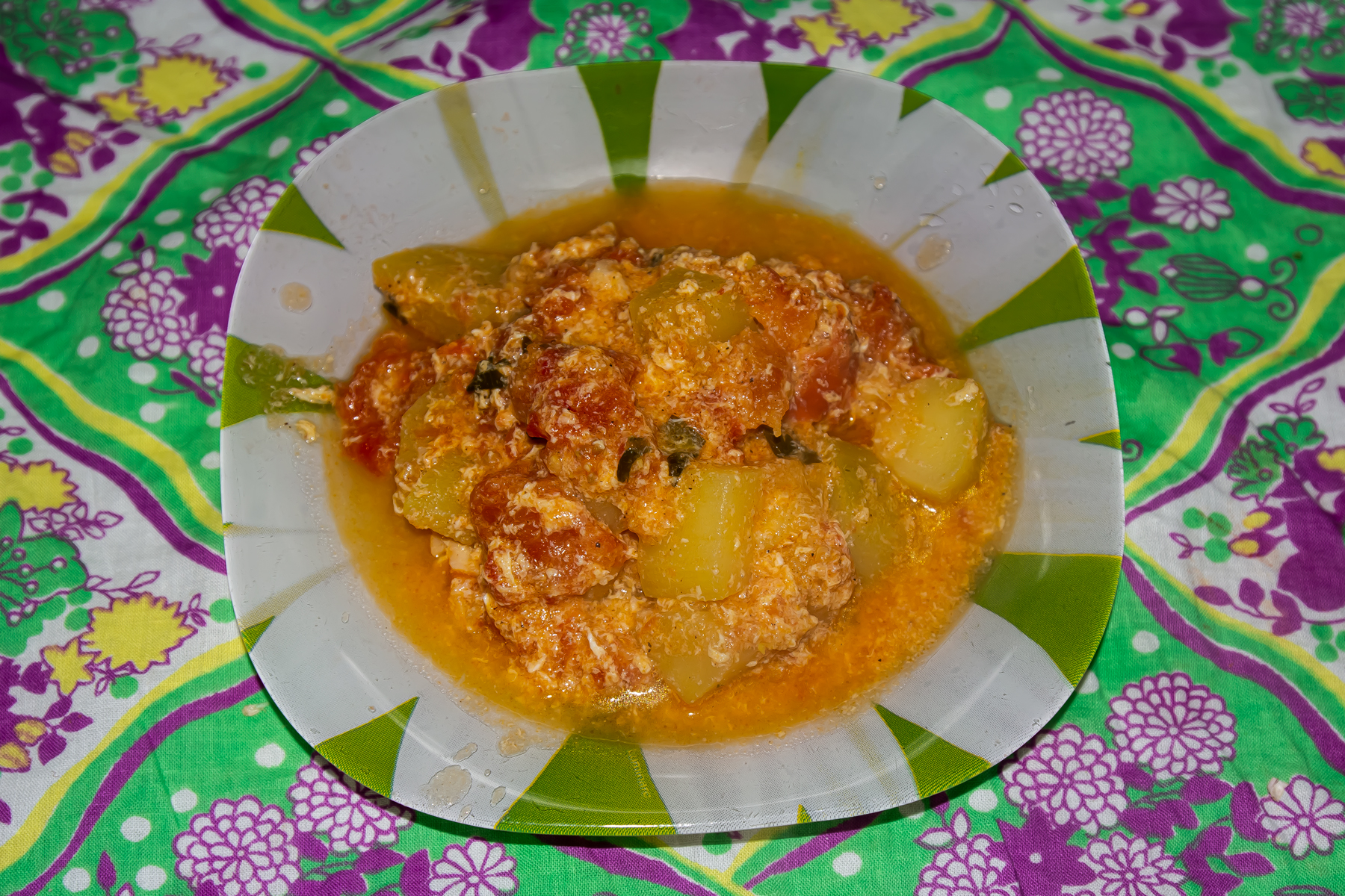 Овощи тушить 15 минут, затем залить взбитыми яйцами, перемешать, посолить, поперчить, нагревать на среднем огне в течение 5 минут, после чего выложить горкой на блюдо и подать к столу.