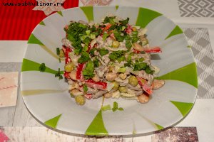 Полученную начинку тщательно перемешайте и наполните ею маринованный перец. Уложите его в форму и посыпьте тертым сыром. Запекайте в духовке 5-7 минут при средней температуре. Подавайте, полив майонезом и украсив веточками укропа.