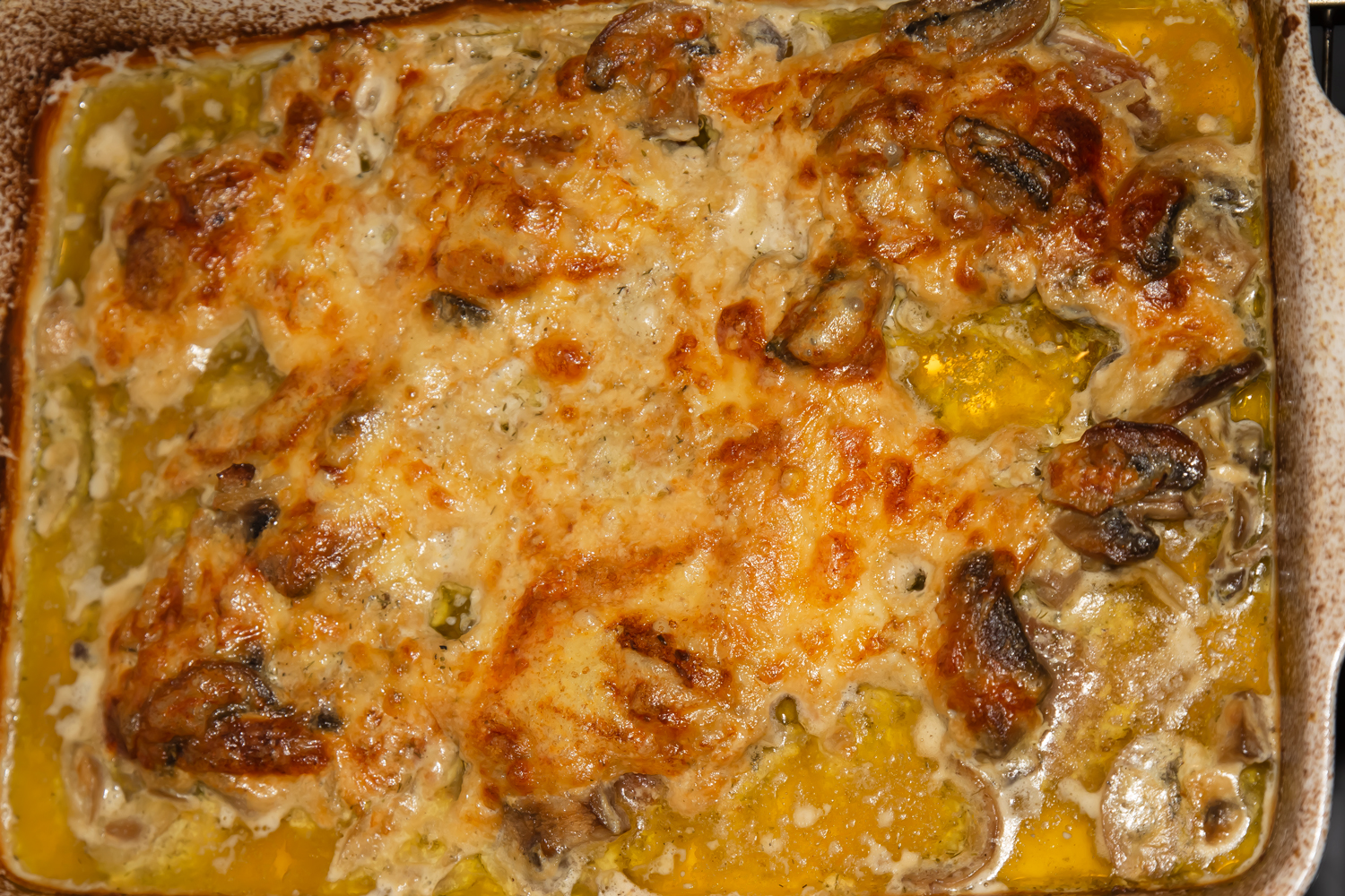 и отправляем в духовку при температуре 200 градусов. Приготовим грибной соус. Промываем свежие шампиньоны, нарезаем на пластинки.