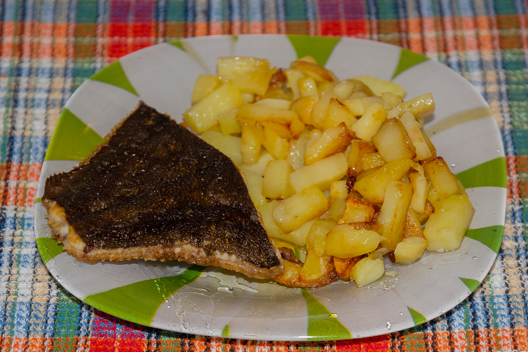 1,2 кг свежей камбалы очистить, вытащить внутренности, снять с обеих сторон кожу, посолить, дать полежать так около часа, обвалять просто в муке или в яйце и тертой булке, а потом в масле и тертой булке пополам с мукой, поджарить с обеих сторон в 4 ст. ложках масла.