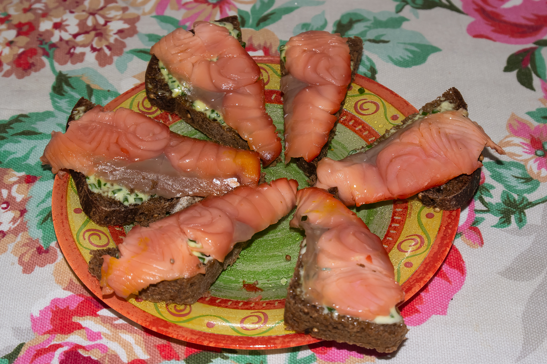 Зеленый лук и укроп промыть. Лук мелко нарезать, смешать с майонезом и карри. Ломтики ржаного хлеба смазать полученной смесью и выложить сверху ломтики красной рыбы.