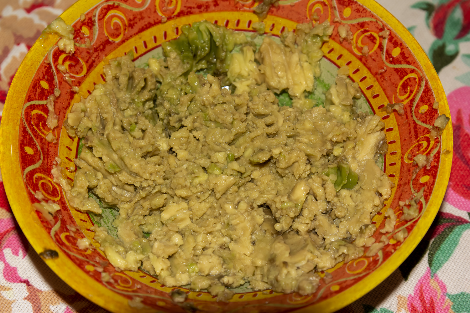 Авокадо очистить, разрезать пополам, удалить косточку. Мякоть авокадо крупно нарезать, положить в миску. Размять вилкой так, чтобы получилась несколько неоднородная масса. Добавить лимонный сок, соль, перец, перемешать массу.
