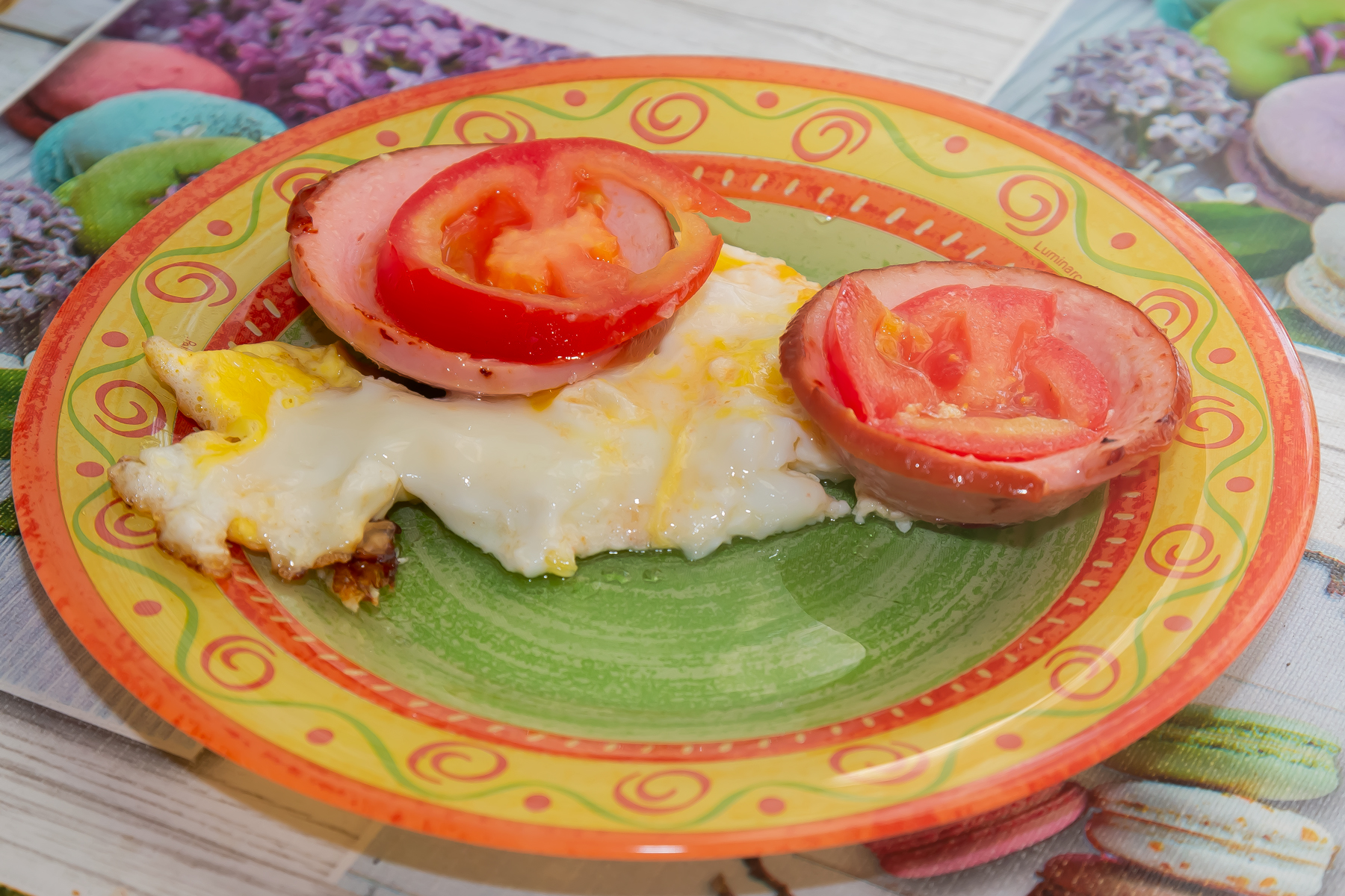 Колбасу нарезаем ломтиками и поджариваем, сверху кладем нарезанные помидоры, выпускаем яйца и жарим на медленном огне. Снимаем с огня, посыпаем зеленью, солим, перчим.