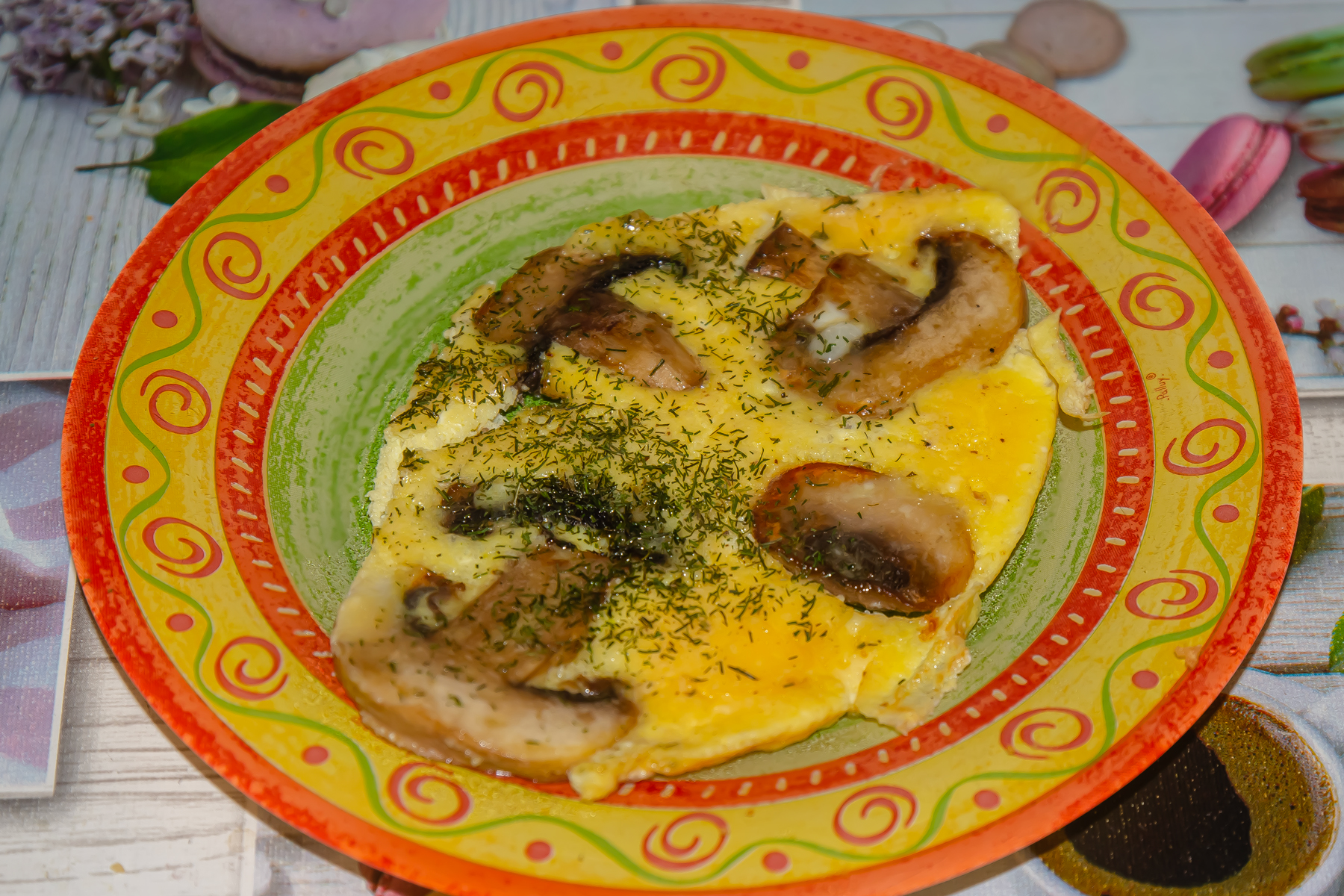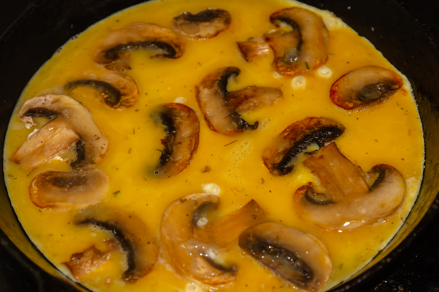 Отдельно взбиваем подсоленные яйца, заливаем ими грибы и жарим до загустевания.