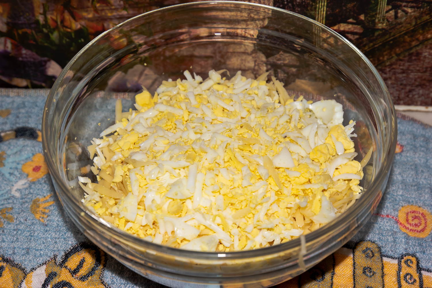 Собираем салат. Первый слой — куриная грудка, смажьте ее майонезом. Твердый сыр натрите на средней терке, выложите следующим слоем. Куриное яйцо сварите вкрутую, почистите и натрите на средней терке. Выложите яйцо поверх сыра.