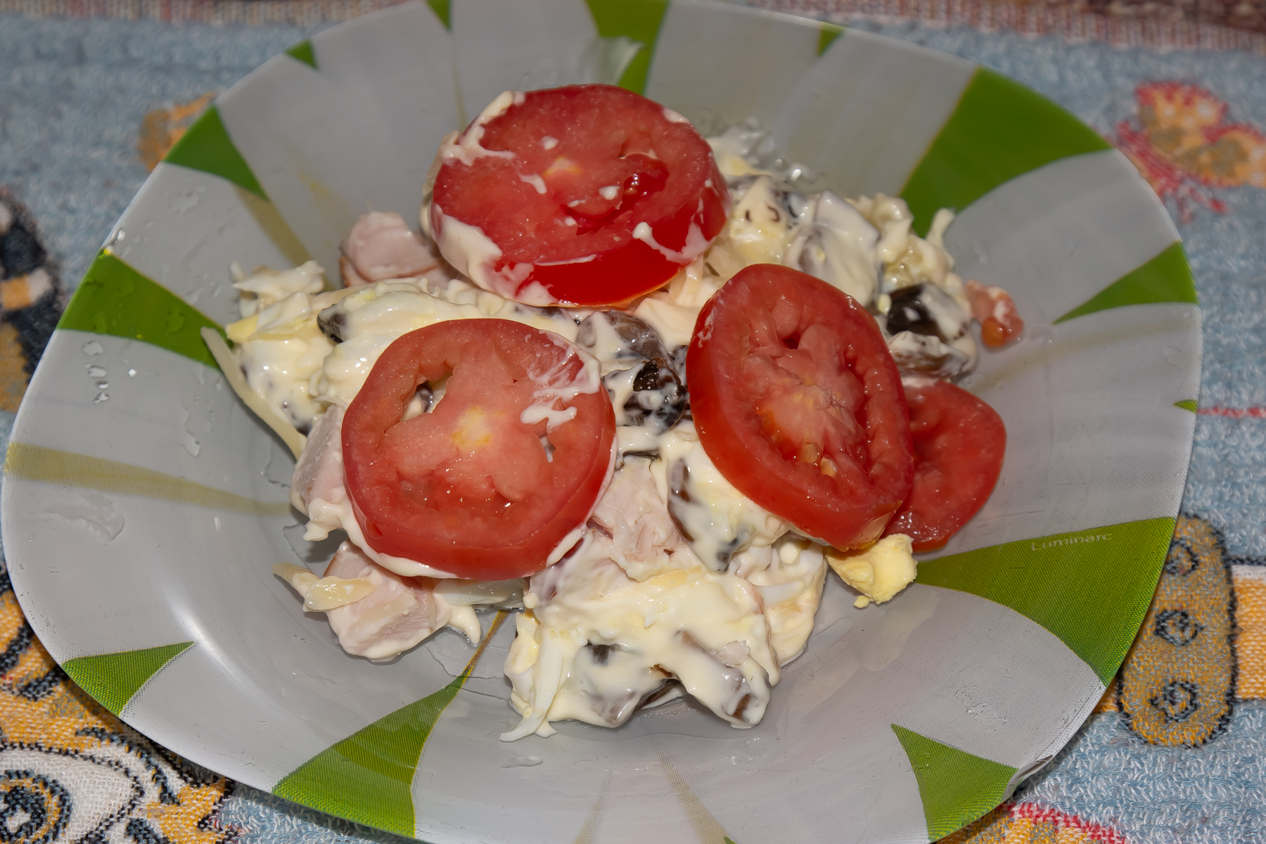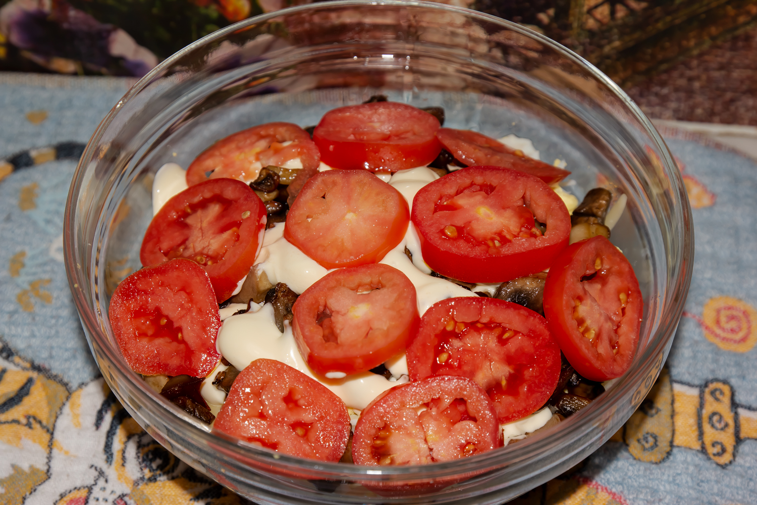 Помидоры нарежьте небольшими пластинами и выложите завершающим слоем.