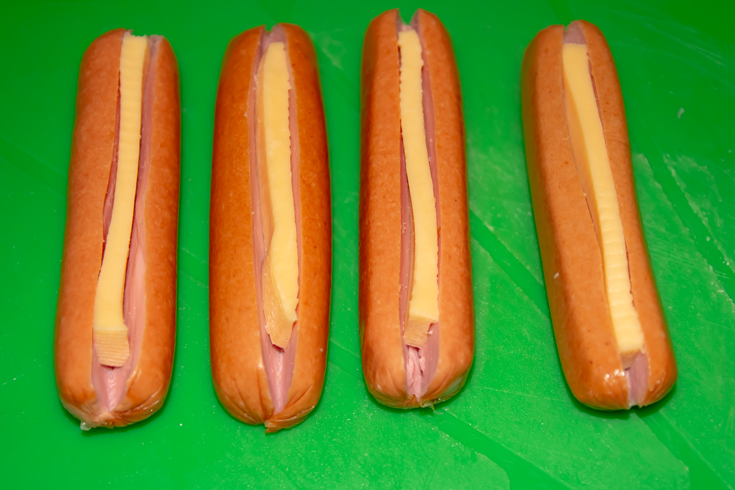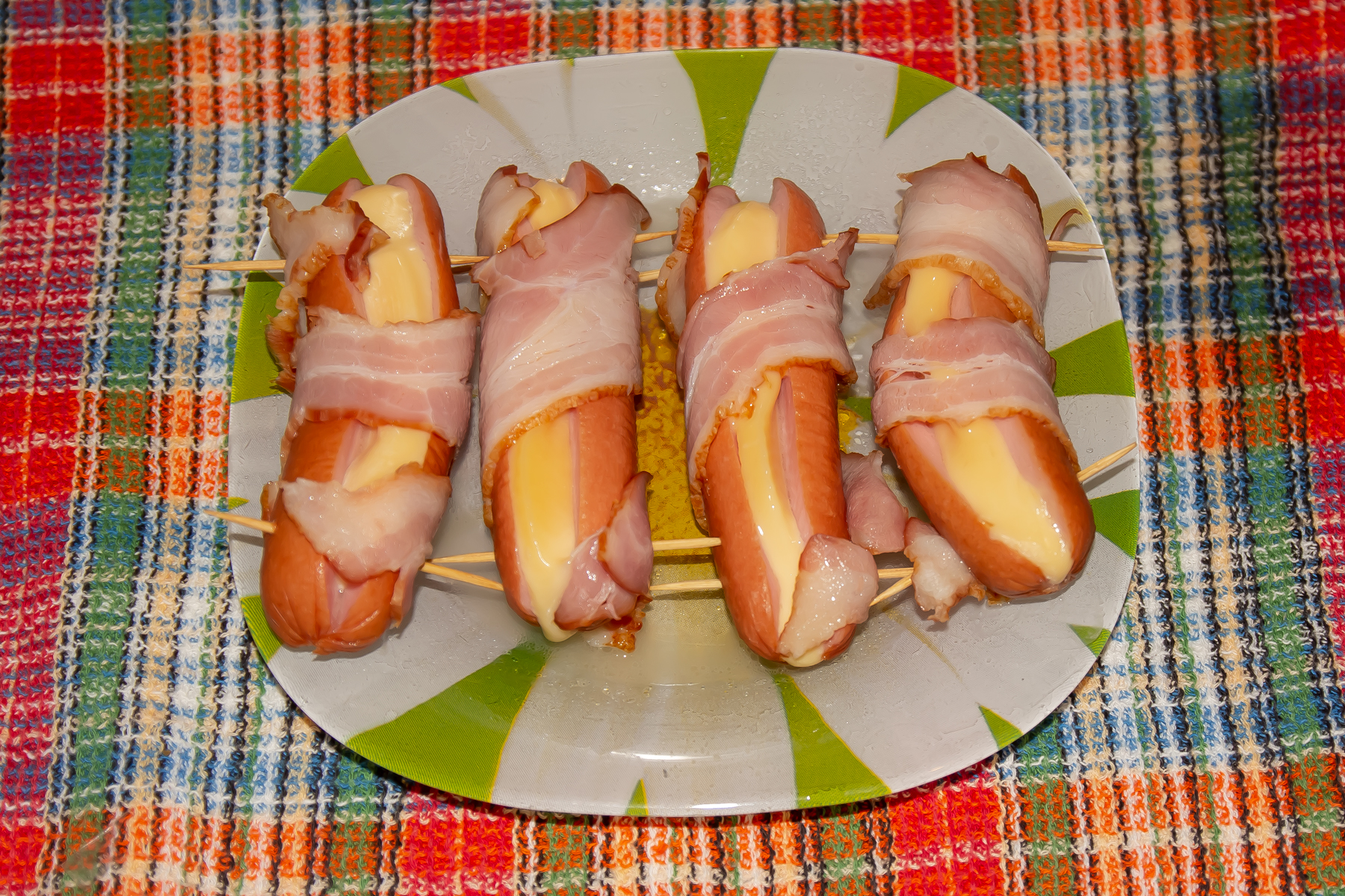 Сосиски (сардельки) глубоко надрезать вдоль, положить в надрез нарезанный соломкой сыр, обернуть ломтиками бекона, сколоть шпажками или зубочистками.