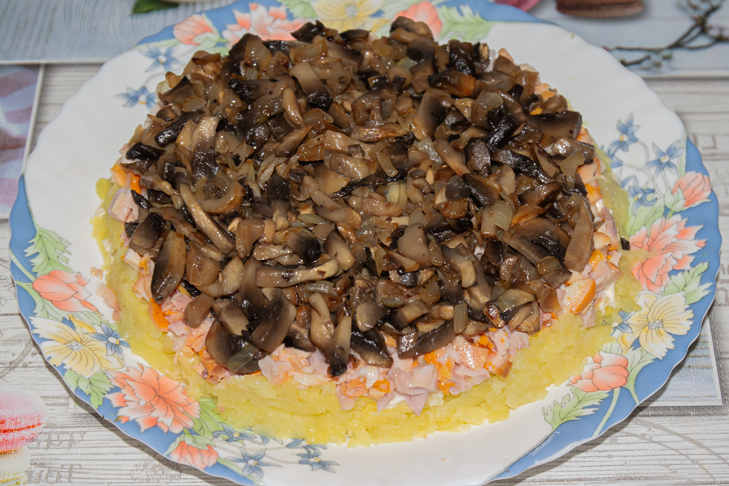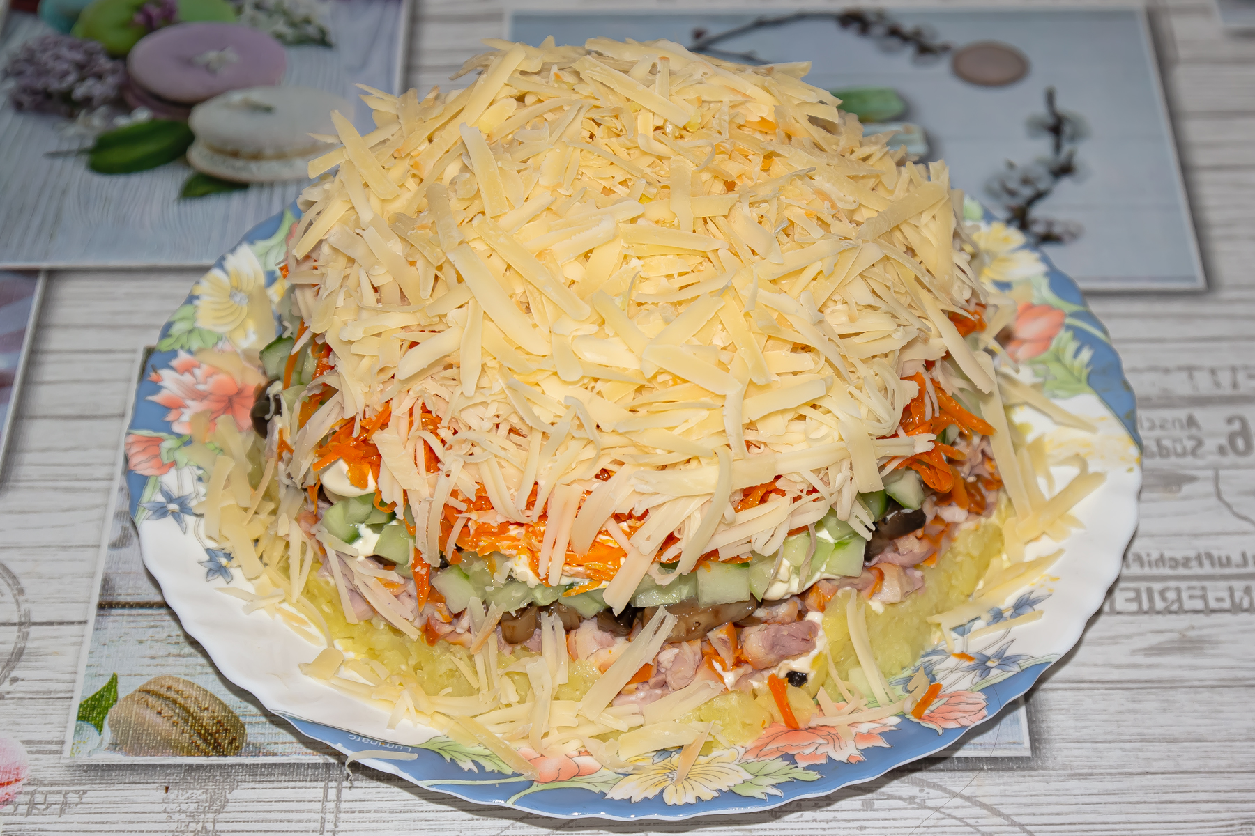 Сытный, питательный, пикантный и очень вкусный салат "Любовница" прекрасно подходит для романтического ужина, новогодних праздников или другого семейного торжества. Приятную остроту придает слоеной закуске копченая курица и корейская морковь.