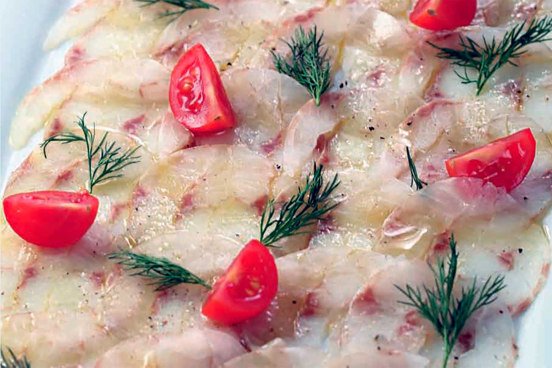Балык нарезать тонкими ломтиками и выложить на тарелку, затем полить соком лимона, ароматным маслом, посыпать рубленой кинзой и дробленым черным перцем.