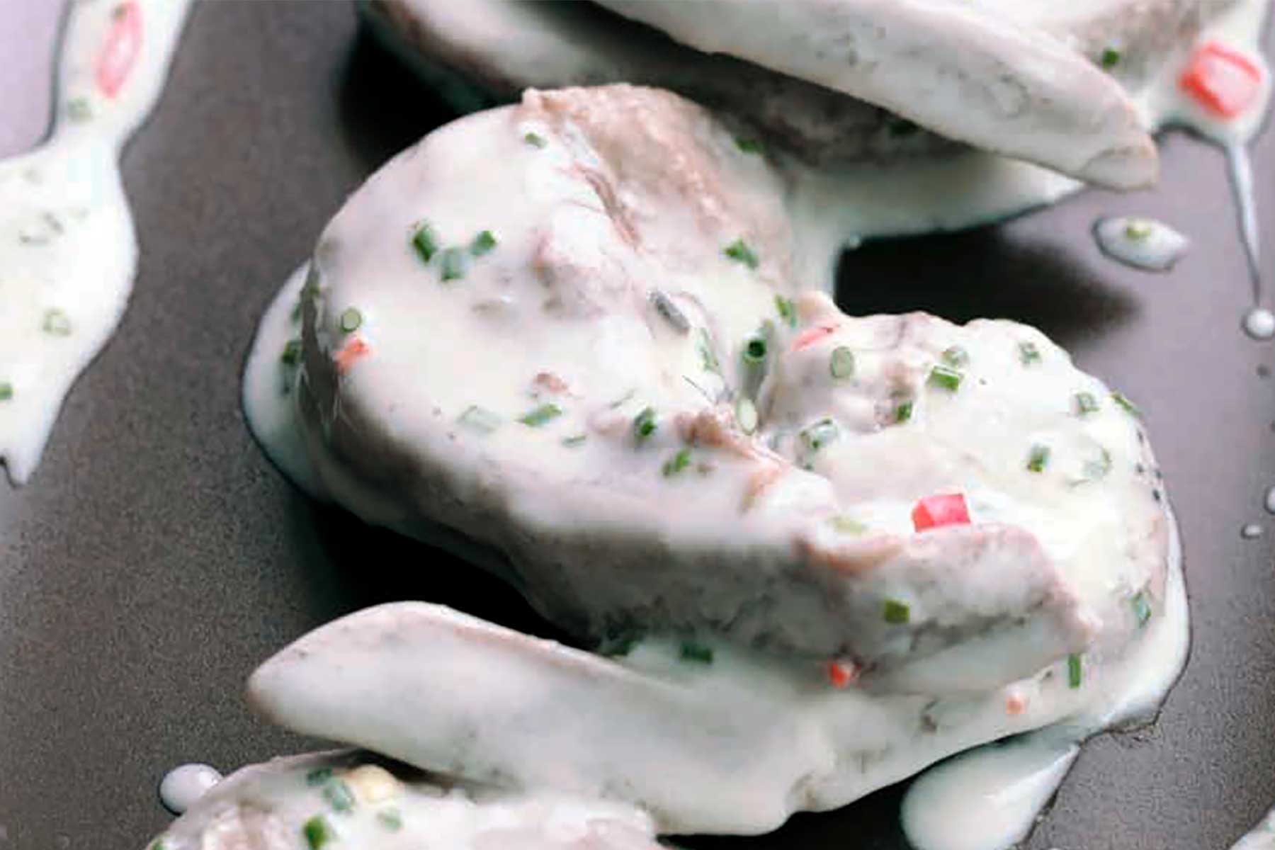 Язычки залить соусом и поставить в холодильник на 1 час. При подаче украсить зеленью.