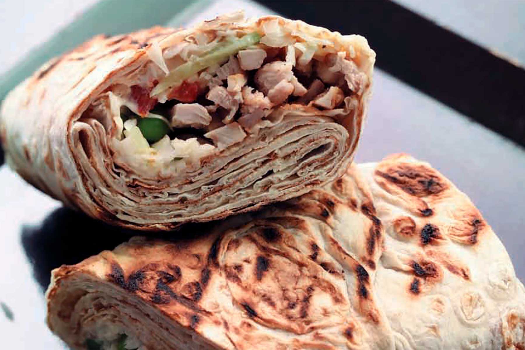 Половину поверхности одного лаваша смазать майонезом, уложить поочередно куриное филе с горошком и салат. Свернуть лаваш в ролл так, чтобы края были закрыты. Обжарить с двух сторон на сковороде гриль или в вафельнице.