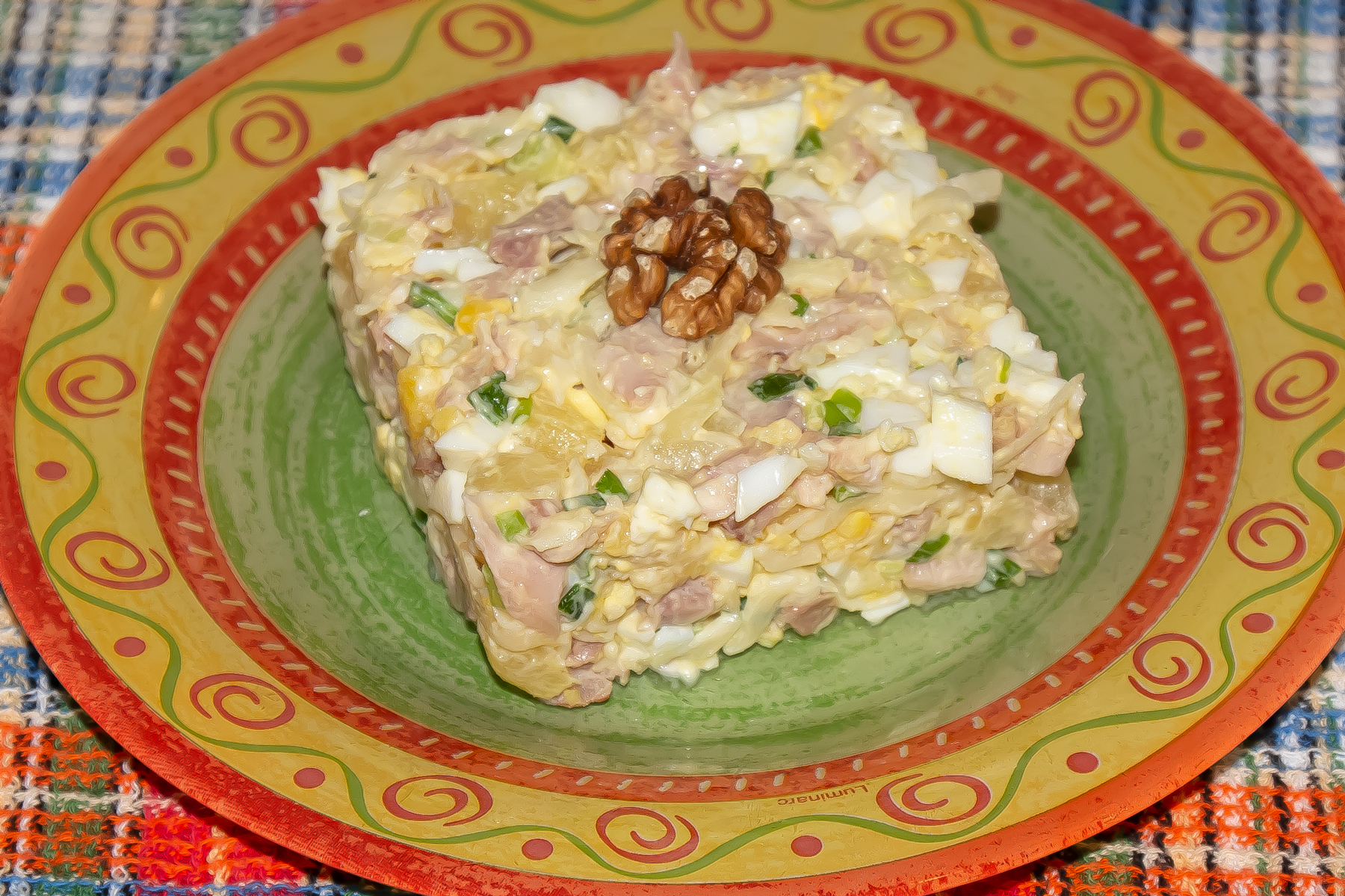 По вкусу добавить репчатый или зеленый лук. Заправить майонезом.