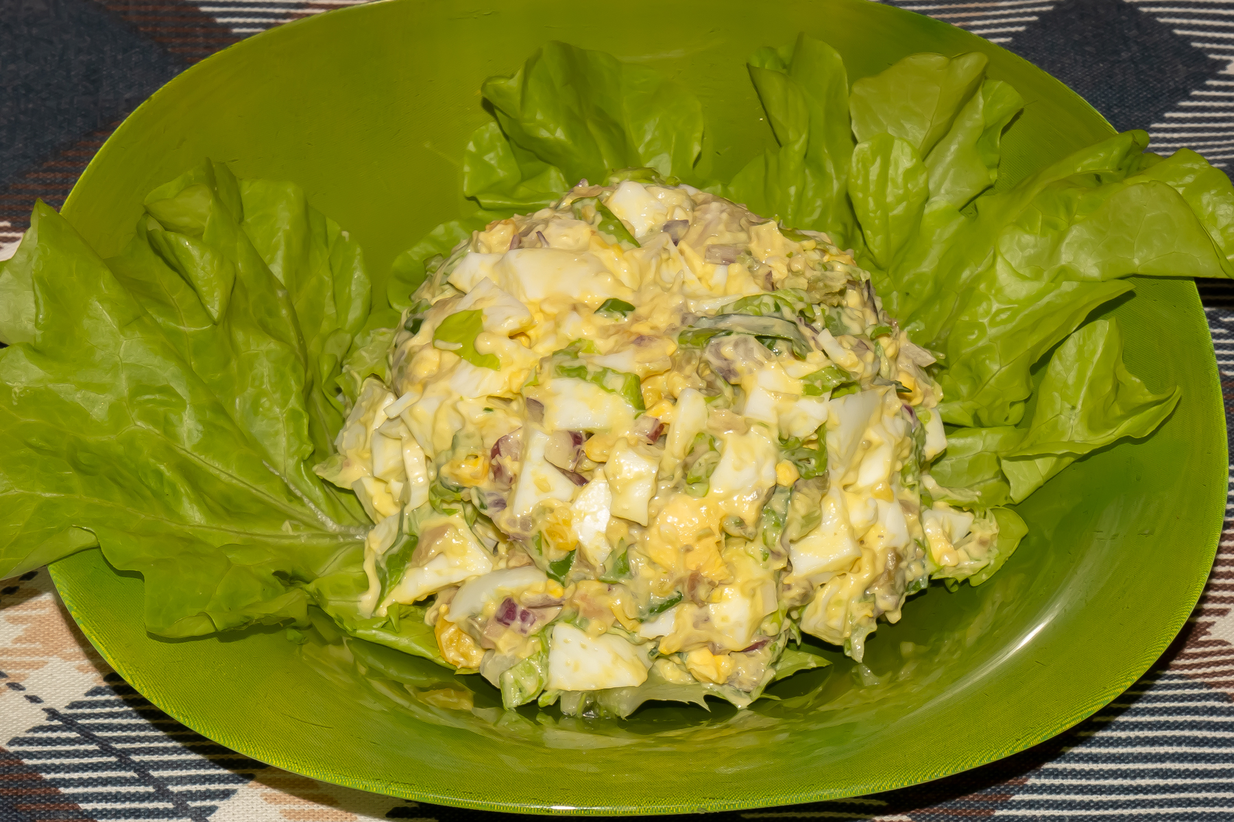 Яйцо очистить от скорлупы и нарезать кубиками.