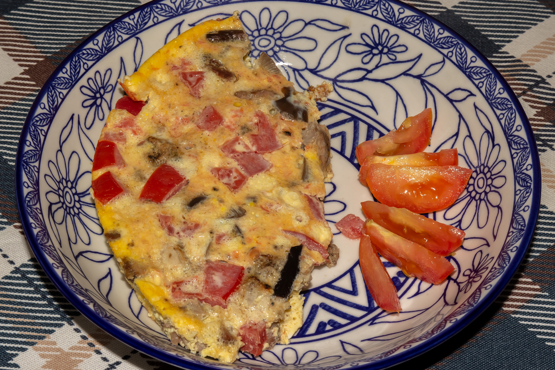 Взбиваем яйца с молоком и солью. Можно добавить немного свежемолотого черного перца. На сковороде разогреваем масло и вливаем яичную смесь, засыпаем мясо. Распределяем равномерно. Туда же отправляем грибы и томаты. Держим содержимое под крышкой на среднем огне около 5 минут. Переверните омлет и обжарьте с другой стороны.