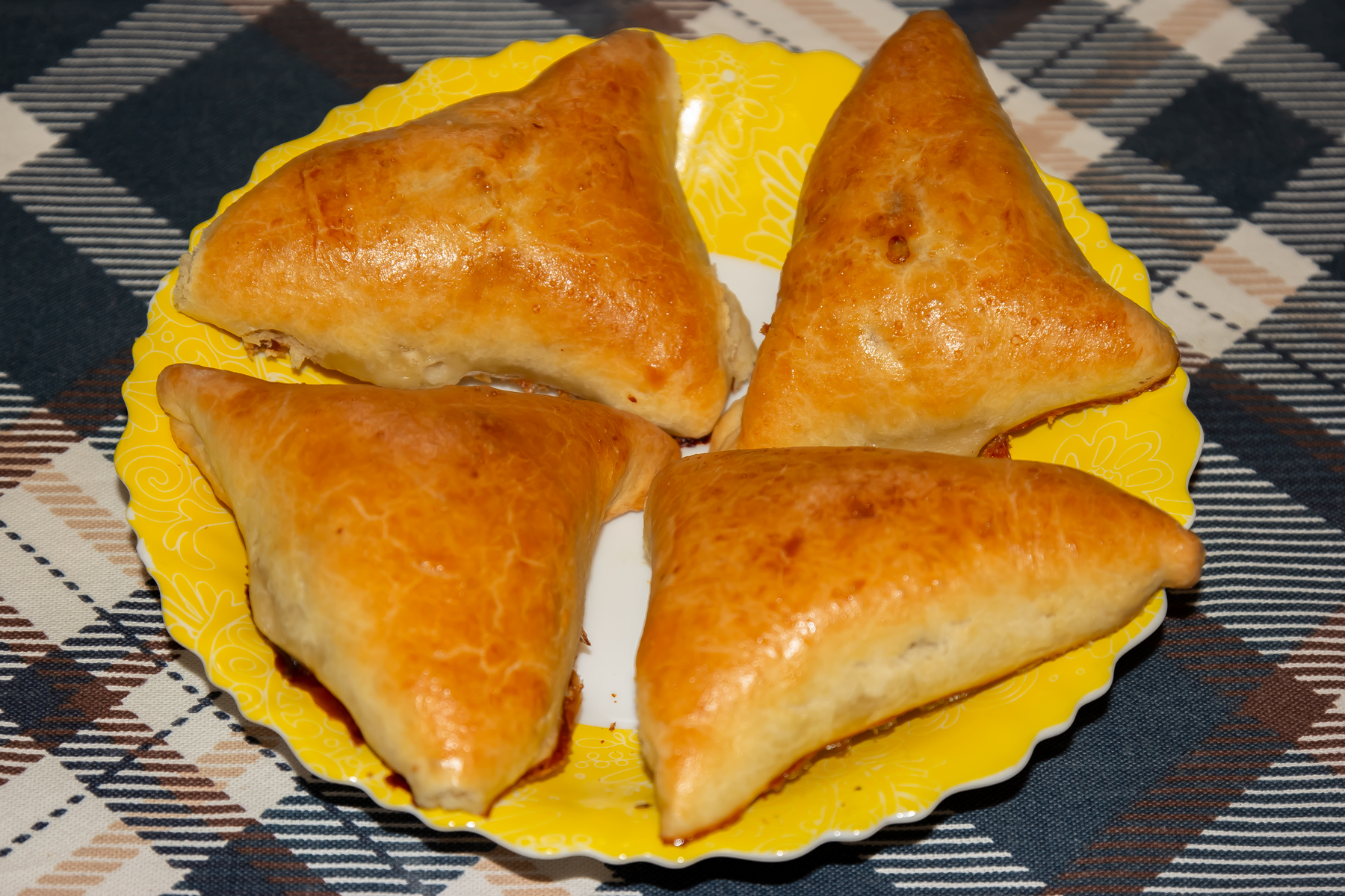 Смешивать мясо и лук будем непосредственно перед лепкой самсы, чтобы фарш не стоял долго. В фарш щедро добавим зиры и черного перца. Холодное и твердое сливочное масло натрем на терке, пересыпая мукой. Воду охладим, можно добавить лед, вода должна быть не просто холодной, а ледяной. В натертое масло всыпем соль, сухие дрожжи, вольем ледяную воду и быстро замесим тесто. Тесто должно получиться средней плотности. Замесив, убираем тесто в холодильник на полчаса. Достаем тесто из холодильника, разминаем, разрезаем на колбаски, а их – на небольшие кусочки. Раскатываем тесто в тоненькие кружочки размером с блюдце. Выкладываем на тесто горку фарша и заворачиваем, перекрывая краями теста начинку с трех сторон. Переворачиваем заготовку сгибами вниз. Духовку разогреваем до среднего жара, градусов 180. Противень смазываем маслом и выкладываем на него самсу. Смазываем ее разболтанным яйцом и ставим печь. Самса выпекается минут 30-40.