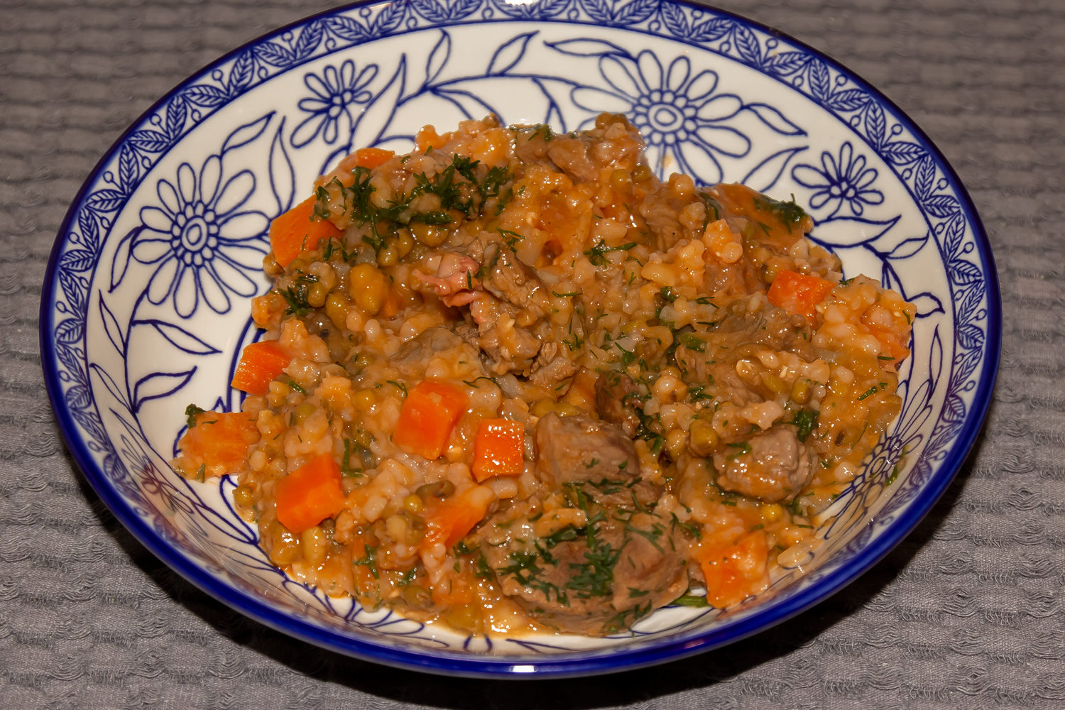Маш и рис промойте, откиньте на сито. Масло разогрейте в глубокой сковороде. Мясо нарежьте на небольшие кусочки