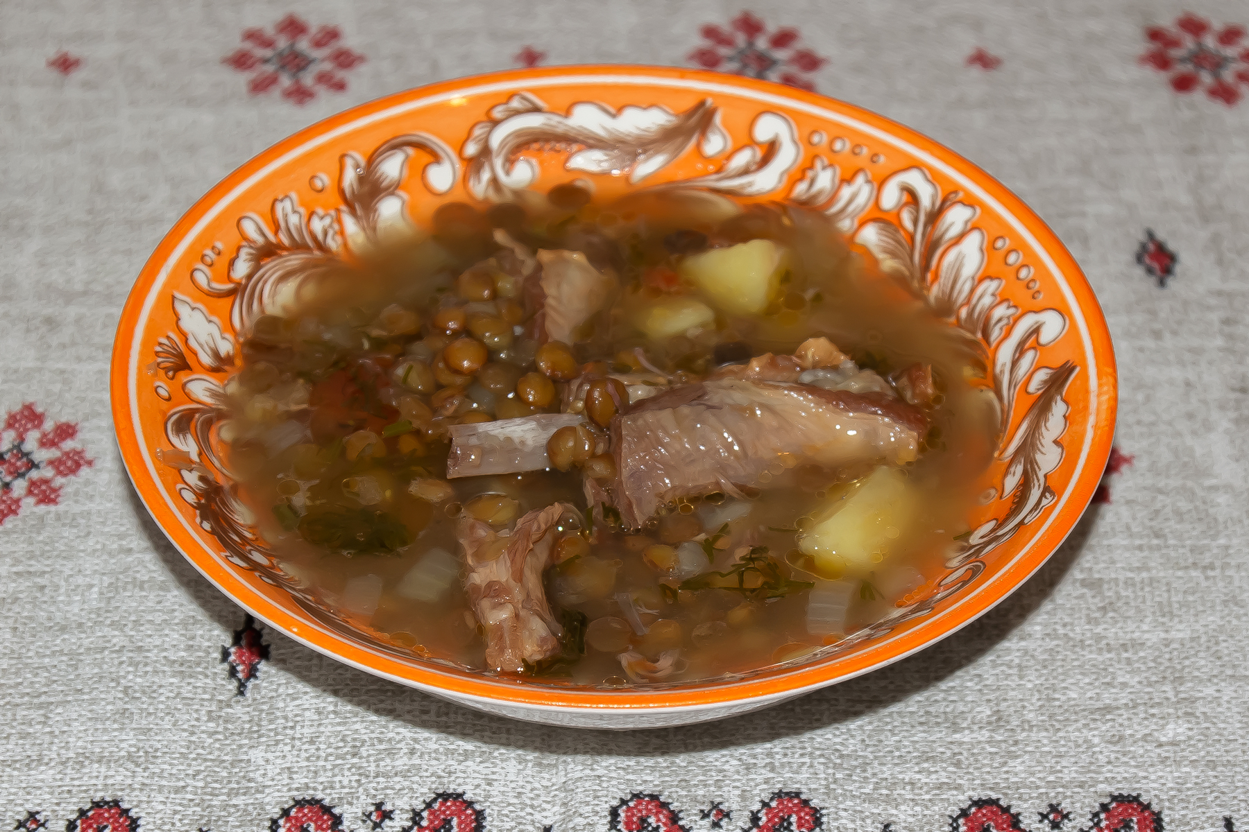 продолжаем обжаривать, пока овощи не станут мягкими, после чего программу «Жарка» выключаем. Картофель чистим и нарезаем кубиками. Всыпаем промытую чечевицу. Добавляем нарезанные кубиками помидоры, соль, душистый перец горошком, лавровый лист. Включаем программу «Суп» на 1 час.