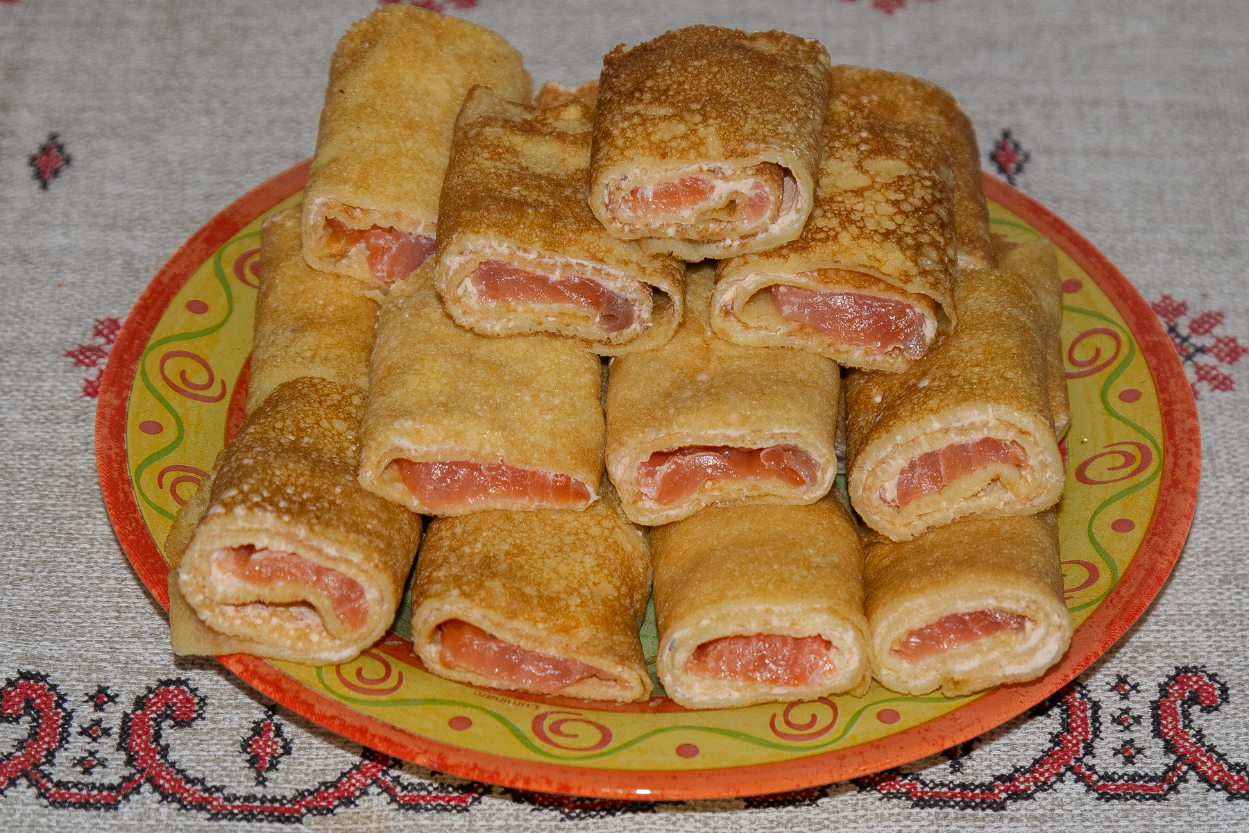 и выкладываем на самую широкую часть блина, чтобы семга была по всей длине блинчика.