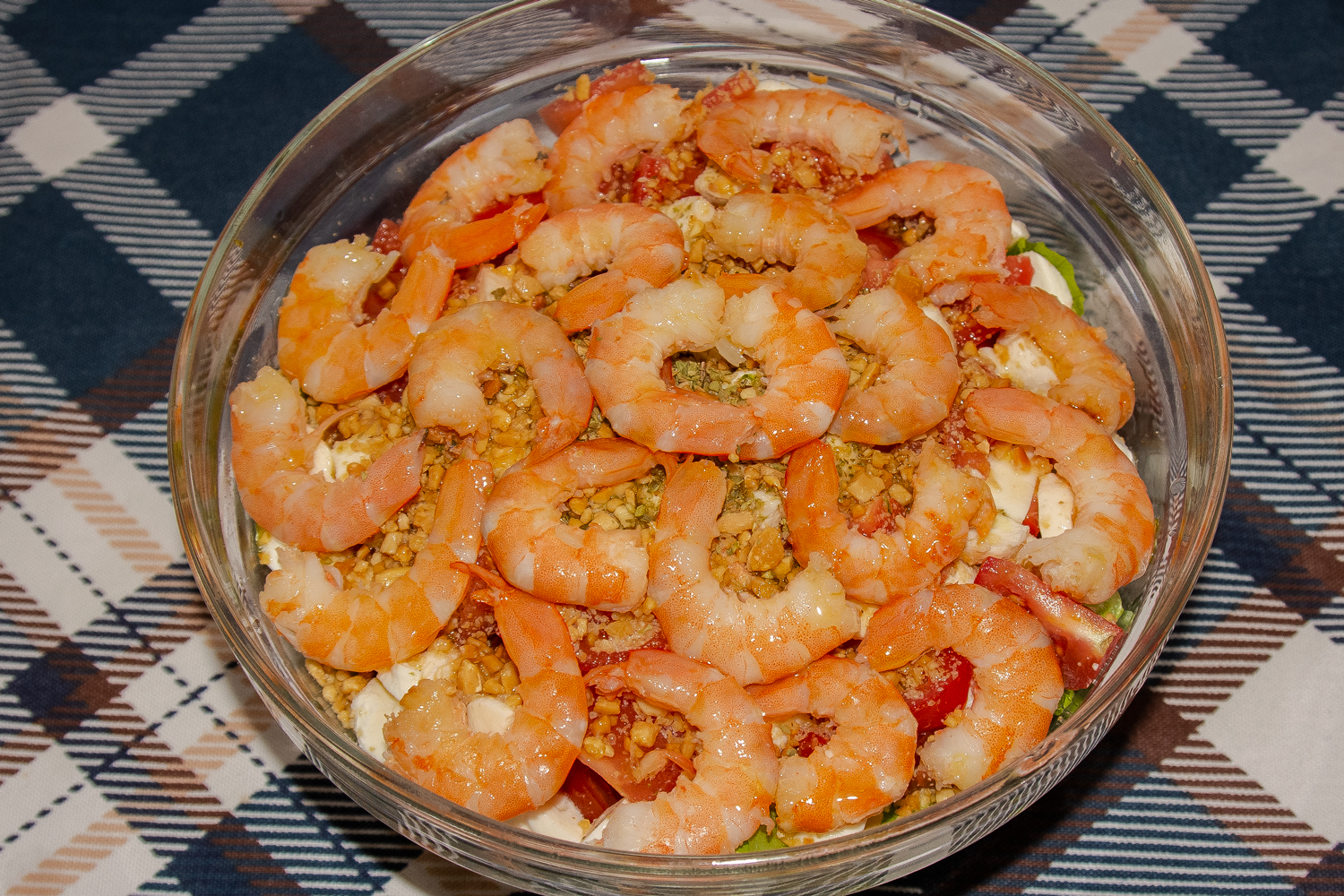 На блюдо выкладываем измельченные листья салата, половинки помидорок черри, мини шарики сыра моцарелла, обжаренные креветки.