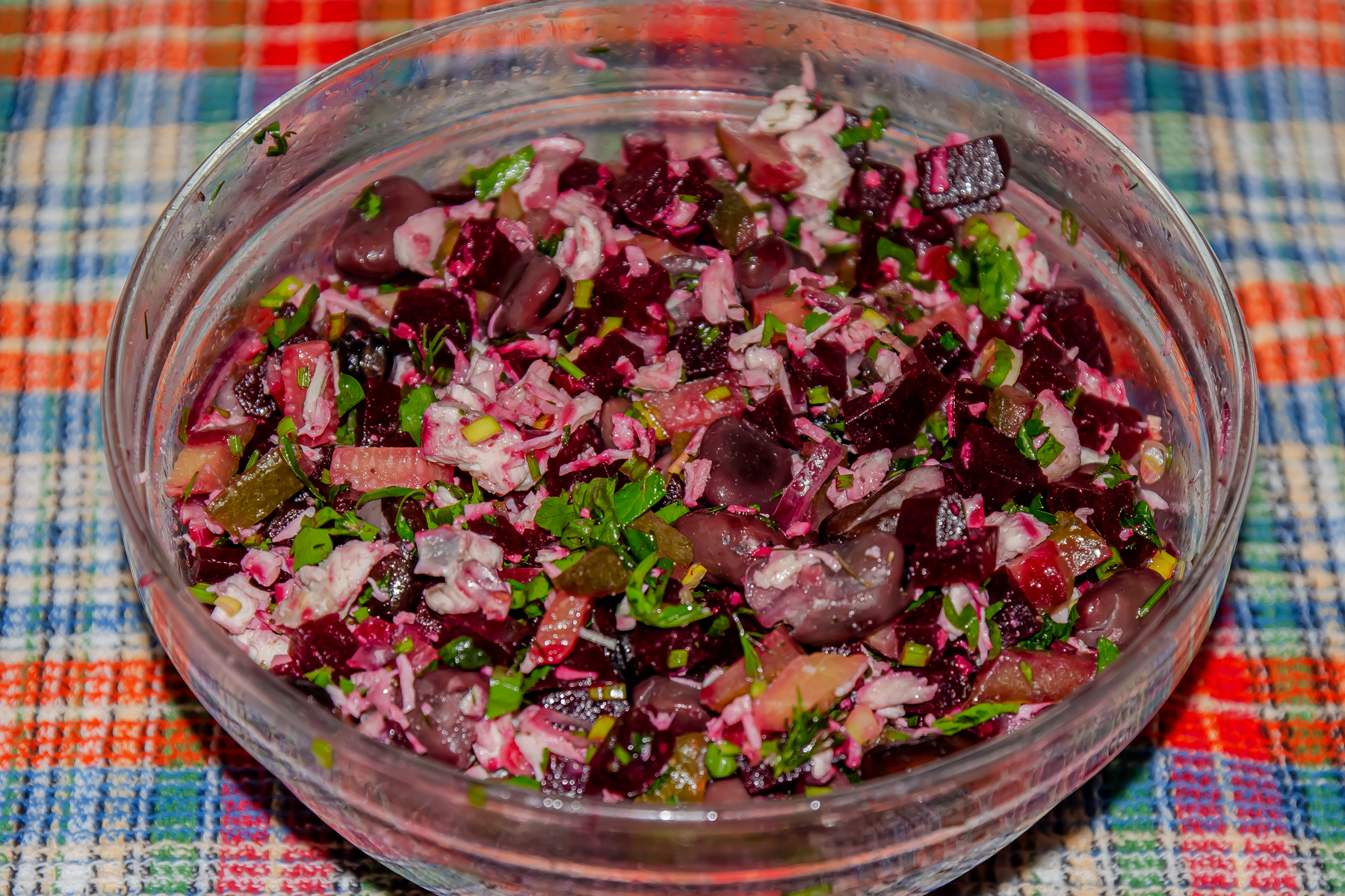 Подготавливаем все продукты. Свеклу и курицу отвариваем. Лук нарезаем и по желанию обжариваем на растительном масле. Все ингредиенты нарезаем и соединяем в салатнике.