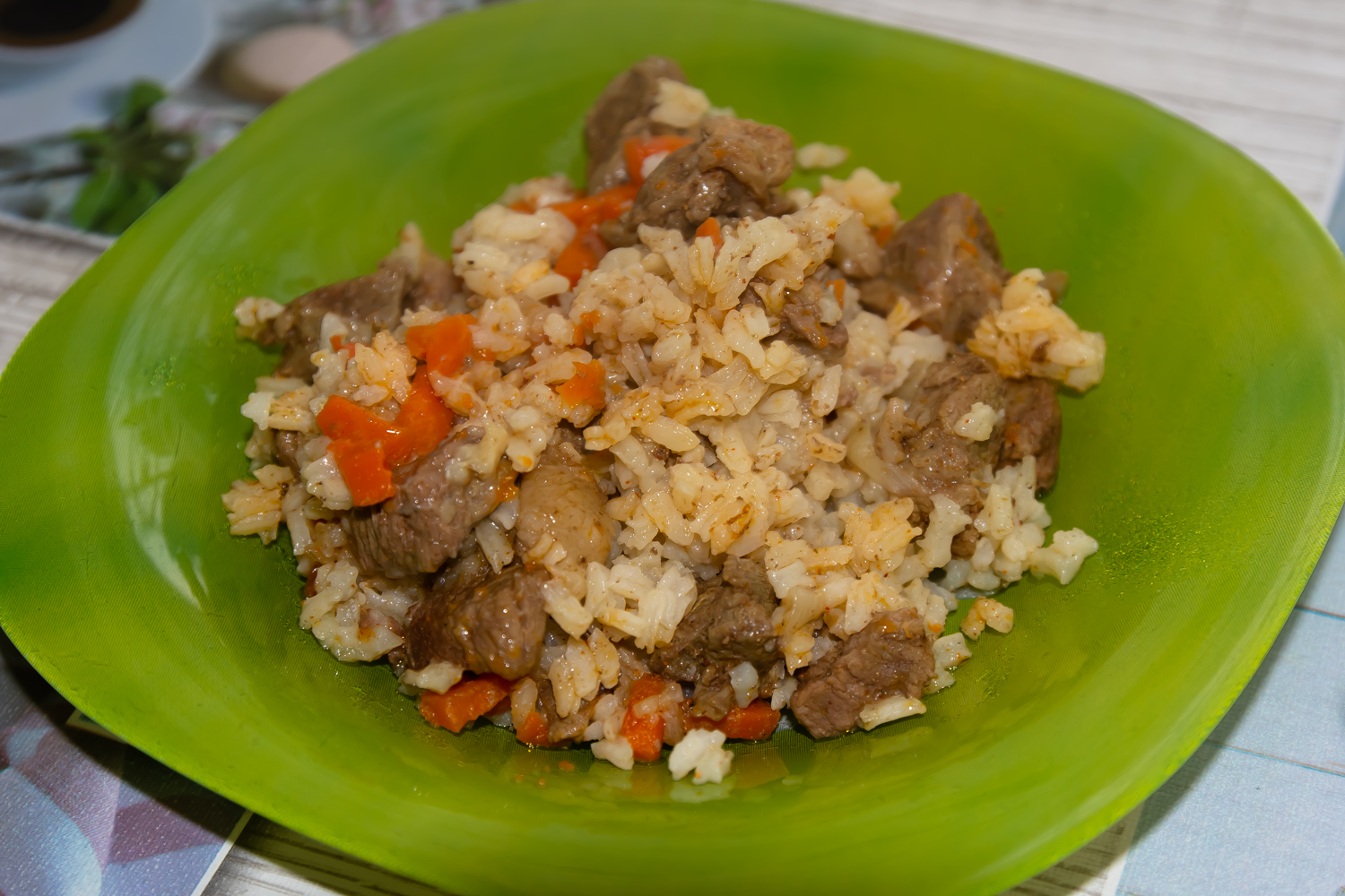 Нарежьте кубиками мясо, слегка обжарьте в жиру, поперчите и посолите. Большую луковицу порежьте тонкими кольцами и уложите его поверх обжаренного мяса. Морковь порежьте тонкой соломкой и засыпьте ею мясо и лук. Сверху положите стакан перебранного и промытого риса. Залейте все водой так, чтобы рис был полностью покрыт водой. Посолите, накройте крышкой и поставьте на 40-50 мин. на слабый огонь или в духовой шкаф при t 200 С. Чеснок крупно порежьте и опустите внутрь почти готового плова. Затем в плов опустите лавровый лист, небольшие кусочки сливочного масла. Ни в коем случае не перемешивайте! Через 7-10 мин. плов готов. Плов уложите на большое блюдо, украсьте зеленью.