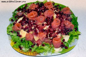 Апельсины очищают и нарезают, так же как и лук, тонкими пластинами, смешивают с маслинами, из которых удалены косточки. Поливают маслом, заправляют солью и перцем.