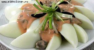 Хорошо вымойте и замочите на несколько часов чернослив, удалить все косточки. Лук-порей нужно нарезать небольшими тонкими кружочками, а мясо и грибы полосками. Подготовленные таким образом продукты смешать и залить смесью оливкового масла и уксуса, к которой не забыть добавить соль, сахар, тмин и перец. Дать салату пропитаться в течении нескольких минут а затем выложить в салатник, украсить кружочками помидора и листьями салата.