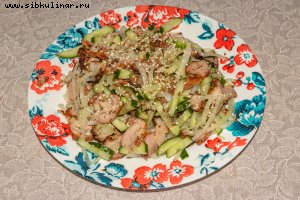 Ветчину, сыр, огурцы и салат шинкуют соломкой и заправляют майонезом. Укладывают в фужер на листья салата. Оформляют салат-коктейль огурцами, перцем и зелёным салатом.