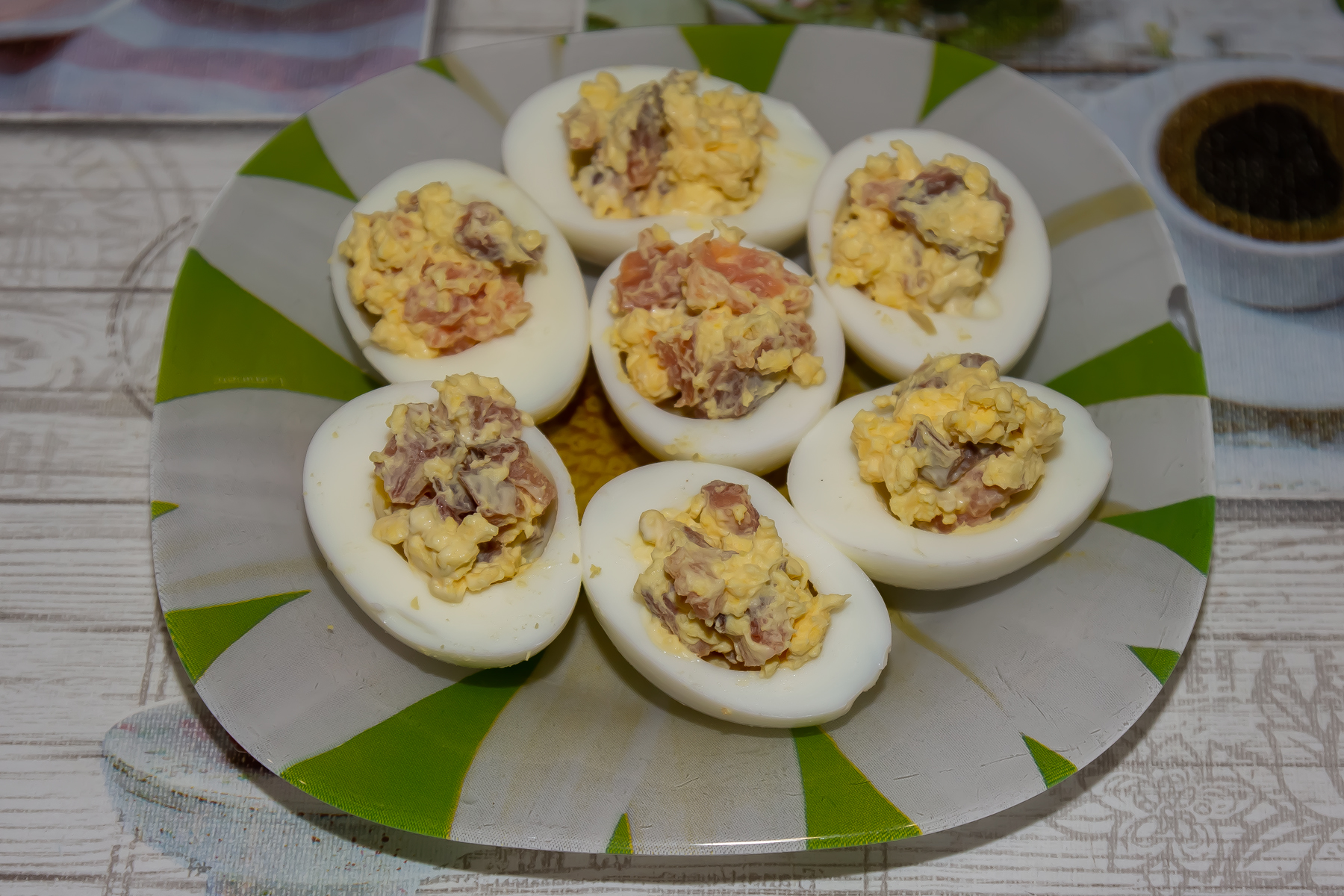 Яйца сварить вкрутую. Под струей холодной воды остудить. Очистить, разрезать вдоль каждое на две части. Аккуратно вынуть из всех половинок желток, в отдельной мисочке размять, добавить майонез и мелкие кусочки мякоти рыбы. Все перемешать. Полученную смесь заложить обратно в половинки яиц горкой.